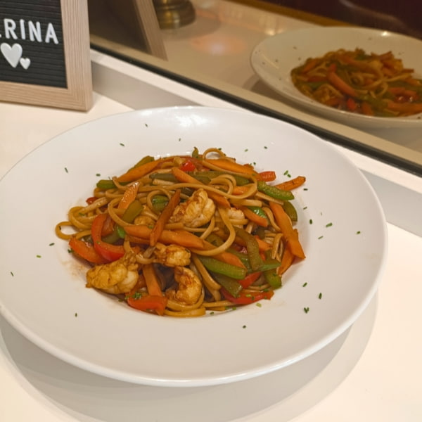 - Tallarines salteados con pollo y verduritas, acompañados de una salsa especial de la casa.
