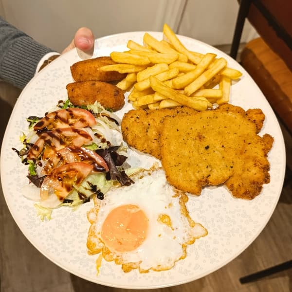 - Milanesa de pollo: servida con patatas fritas, huevo, ensalada y croquetas.