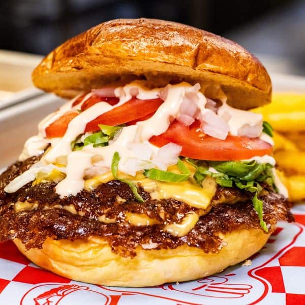 El sello distintivo de Krusty Burger está en su carne. No se trata de una simple smash burger tradicional, sino de medallones carnosos y jugosos, con el exterior perfectamente caramelizado y crujiente, y un interior tierno que conserva todo su sabor.