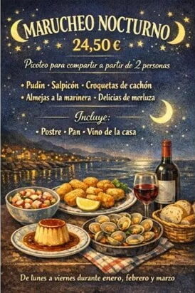 Y para finalizar el día, «El marucheo nocturno» una propuesta pensada para compartir y disfrutar de sus pescados y mariscos.